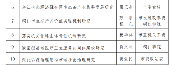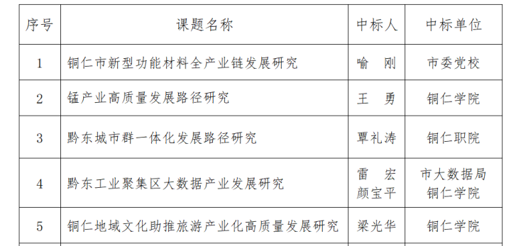 按照《中共铜仁市委重大决策问题研究课题管理办法》,市委重大课题领导小组办公室于5月6日组织召开2022年市委重大课题立项评审会,经决策智库专家组评审,拟确定市委党校、铜仁学院、铜仁职院等为2022年中共铜仁市委重大课题中标单位。现予公示: