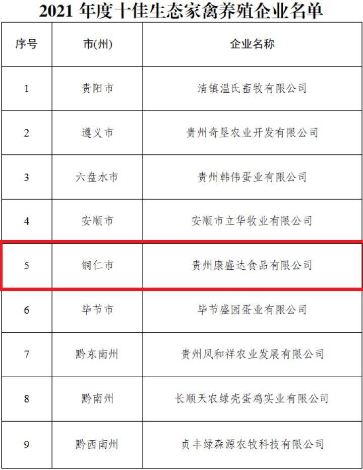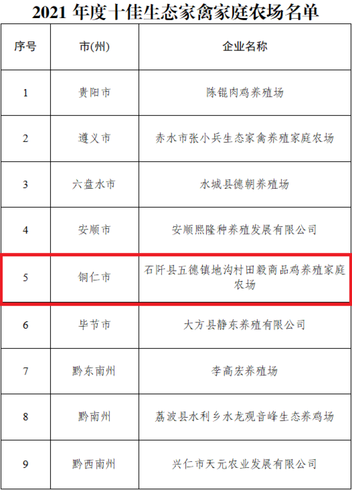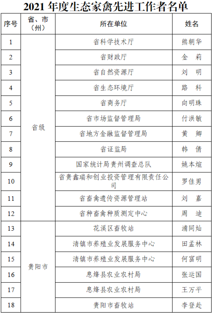 经所在市(州)和单位推荐,并组织专家评审,贵州省农业农村厅拟推荐9家十佳生态家禽养殖企业、9家十佳生态家禽家庭农场、60名先进工作者作为2021年度全省生态家禽产业先进单位和个人,现予以公示。公示期7天(2022年5月27日至6月2日),如有异议,请向省生态家禽产业发展领导小组办公室联系(联系人:李建伟联系电话:85864865),如有投诉,请向省农业农村厅机关党委纪检部门反映(联系人:吴义全联系电话:85864639)。