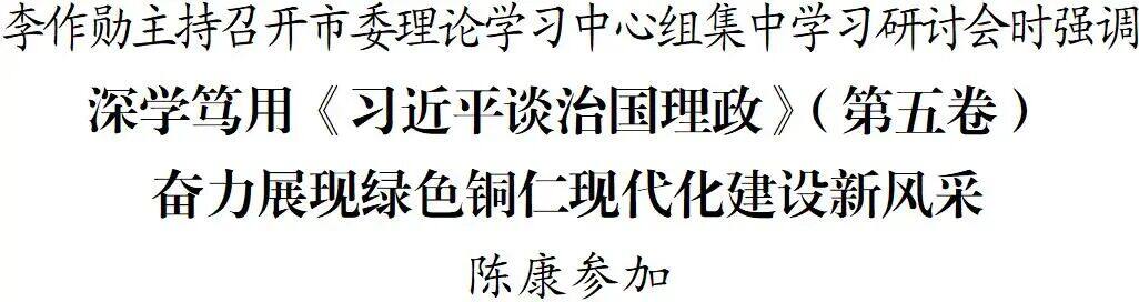9月25日,市委理论学习中心组集中学习研讨会举行,专题学习《习近平谈治国理政》(第五卷)。市委书记李作勋主持并讲话。他强调,要深学笃用《习近平谈治国理政》(第五卷),更加深刻把握习近平新时代中国特色社会主义思想的丰富内涵和实践要求,坚持生态优先、绿色发展,奋力展现绿色铜仁现代化建设新风采。