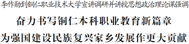 12月3日,市委书记李作勋到铜仁职业技术大学宣讲党的二十届四中全会和省委十三届八次全会精神,调研学校建设发展情况并讲授思想政治理论课,强调要奋力书写铜仁本科职业教育新篇章,为强国建设民族复兴家乡发展作更大贡献。市领导侯刚、许飞、李俊宏参加。
