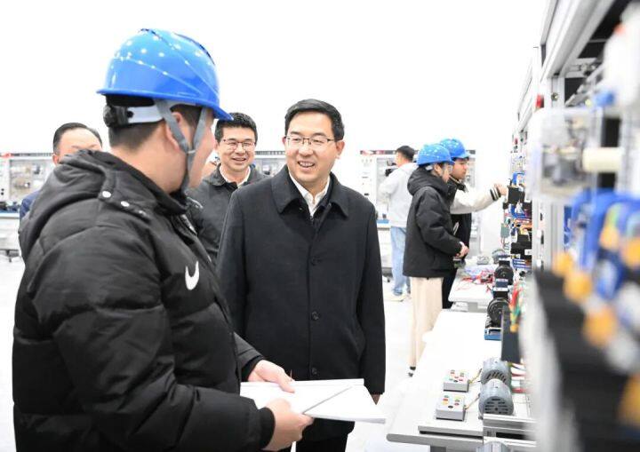图为李作勋到高新区校区实训基地,详细了解学校招生、专业设置、学生实训等情况。