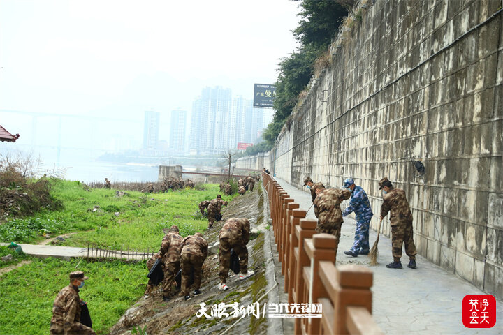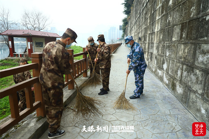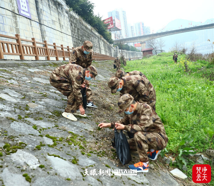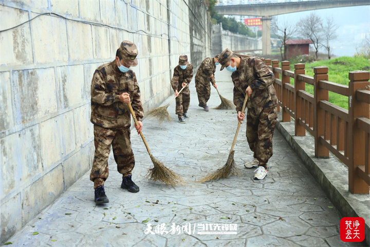 活动现场,预定新兵们身穿迷彩服、精神饱满,他们有的拎着垃圾袋,用夹子认真清理河堤上的各种垃圾和废弃物,有的拿着清洁球和抹布仔细擦拭桥梁两侧的护栏。