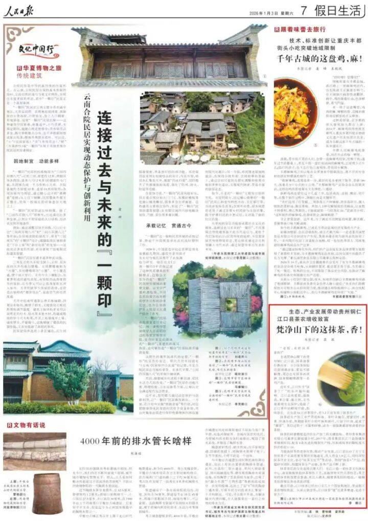 1月3日,《人民日报》第7版刊发《生态、产业发展带动贵州铜仁江口县茶农增收致富 梵净山下的这抹茶,香!》,关注铜仁市抹茶产业发展。全文如下。 生态、产业发展带动贵州铜仁江口县茶农增收致富 梵净山下的这抹茶,香! 在铜仁市江口县双江街道一家抹茶体验馆拍摄的抹茶饮料制作过程。李鹤 摄 “老板,来杯抹茶拿铁!” 走进梵净山脚下的贵州铜仁江口县,抹茶清香扑鼻而来。不少抹茶体验店前围满游客,要是不够解馋,周边还有抹茶冰淇淋、抹茶精酿啤酒等一系列产品。 近年来,江口作为“抹茶工厂”的名声越叫越响。江口县纬度低,海拔高,多云雾,寡日照,且当地重视生态保护,造就了江口茶叶的鲜爽甘甜,韵味悠长。在全县16万亩茶园中,有3.2万亩专用于抹茶生产。 抹茶的生产加工有严苛的标准。茶叶采摘后,需要切叶、蒸青、快速冷却,再剔除茶叶中的叶脉和黄叶,只留下叶肉,就成了“碾茶”。再经过烘干、灭菌和研磨,成为一袋袋裹着浓厚清香的抹茶粉。 抹茶的研磨精度是评价生产加工的关键指标。贵州贵茶集团有限公司董事长蒙祖德介绍,2017年,贵茶集团在江口县投建抹茶精制车间,配有4条先进的精制生产线,所制成抹茶的颗粒度不到奶粉的1/10。 为提高抹茶的竞争优势,推动产业发展,江口县出台了关于支持抹茶产业高质量发展的实施意见,投入资金1.8亿元,同时深挖抹茶历史文化,承办“抹茶文化节”等活动。围绕“抹茶+”产品,组建研发团队,构建抹茶全产业链,各类产品不断上新。 抹茶背后的文化也吸引着人们。在江口县一家抹茶文化体验中心,游客既能体验抹茶制作工艺,还能欣赏宋代点茶技艺:茶艺师将抹茶粉放置在茶盏,再注入沸水,随着茶筅轻轻搅动,一幅精美的图案在茶汤表面浮现。 截至目前,江口抹茶已经出口至几十个国家和地区,带动数万茶农增收致富。从深山到世界,江口抹茶“链”出更多赛道,走进千家万户。(苏滨)