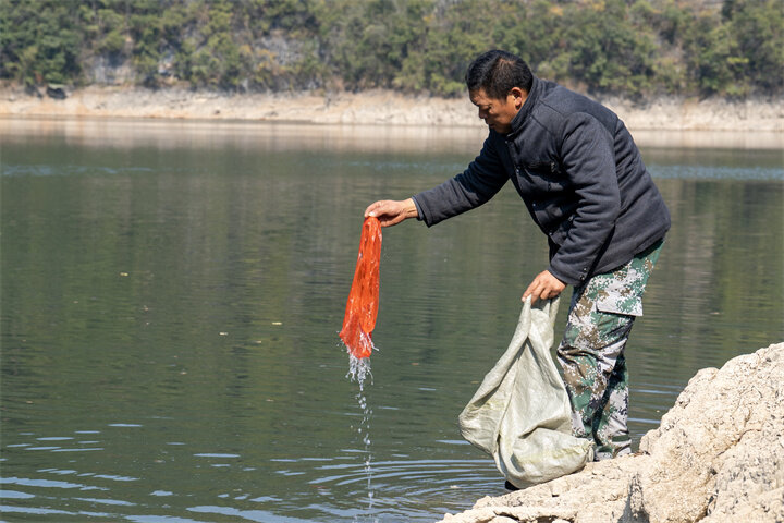 “青山绕绿水,鸳鸯泛清波。”12月1日清晨,阳光轻轻拂过层林尽染的山峦,洒向清波荡漾的鸳鸯湖,贵州石阡鸳鸯湖国家湿地公园的管护员王金喜就开始了一天的工作——搬上几袋谷物,驾驶巡逻船驶向园区的固定投食点,将谷物撒向地面。