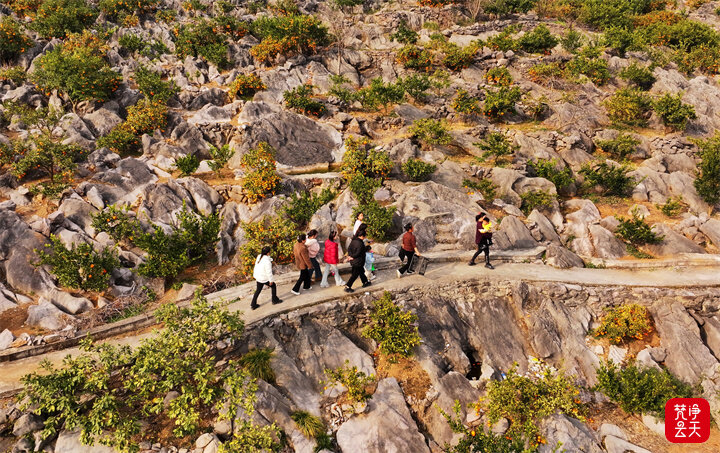 在印江自治县朗溪镇河西村石漠化治理区,延绵数公里的石山上橘香四溢,黄灿灿的柑橘挂满枝头、红满山坡,在阳光的照射下把石山点缀得分外美丽,游客或结伴穿行于观光道上,或走进果园中体验采摘的乐趣,成为当地冬季乡村游一道靓丽的风景线。