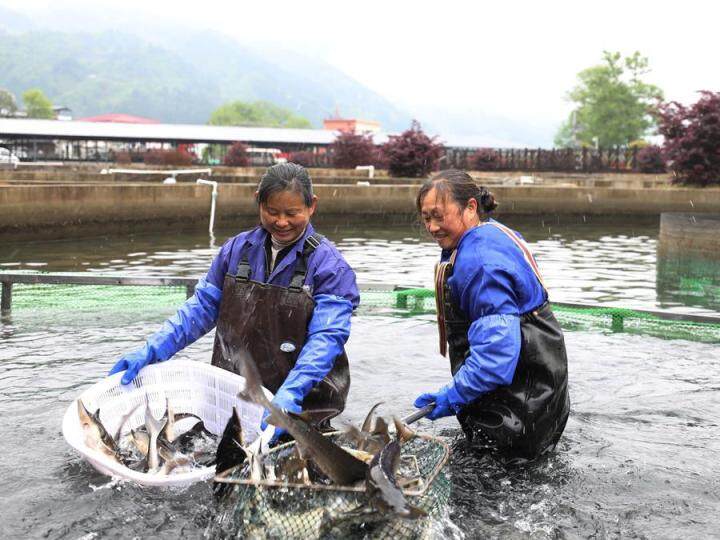 2021年4月10日,位于贵州省铜仁市江口县德旺乡净河村的鲟鱼养殖基地内,工人正在捕捞成品鱼,供应周边市场。李鹤 摄