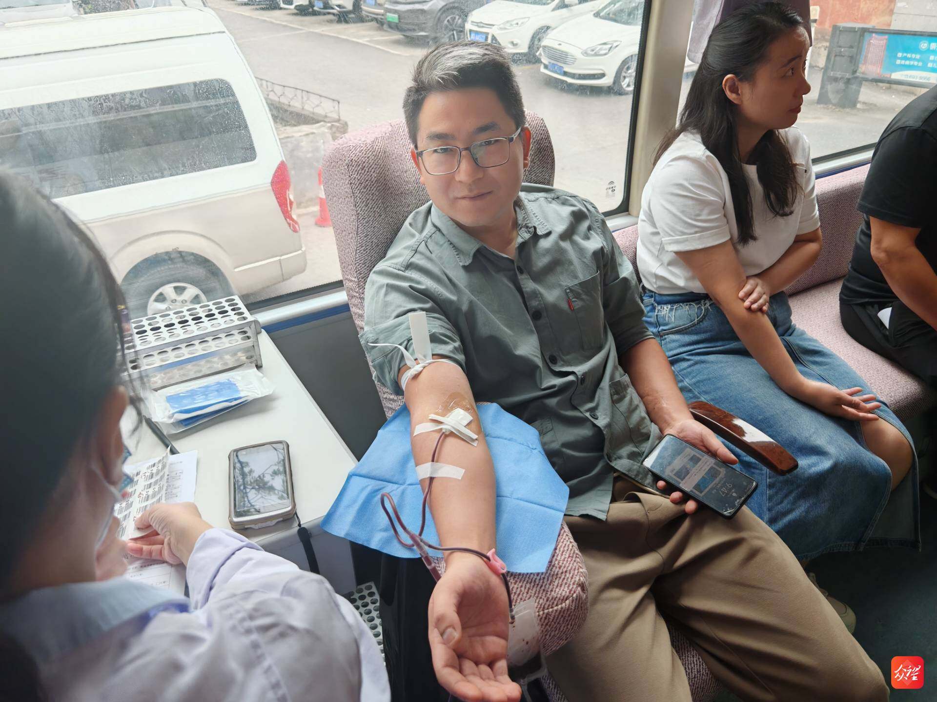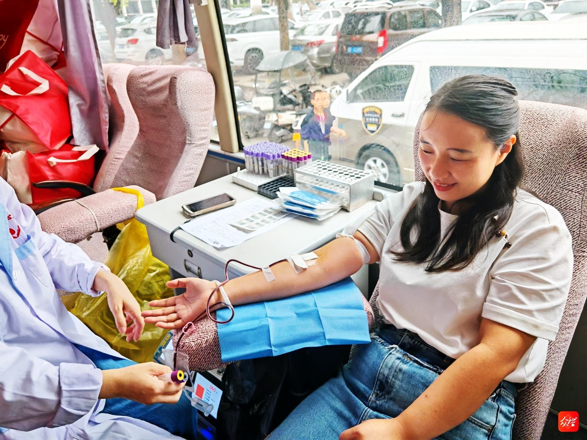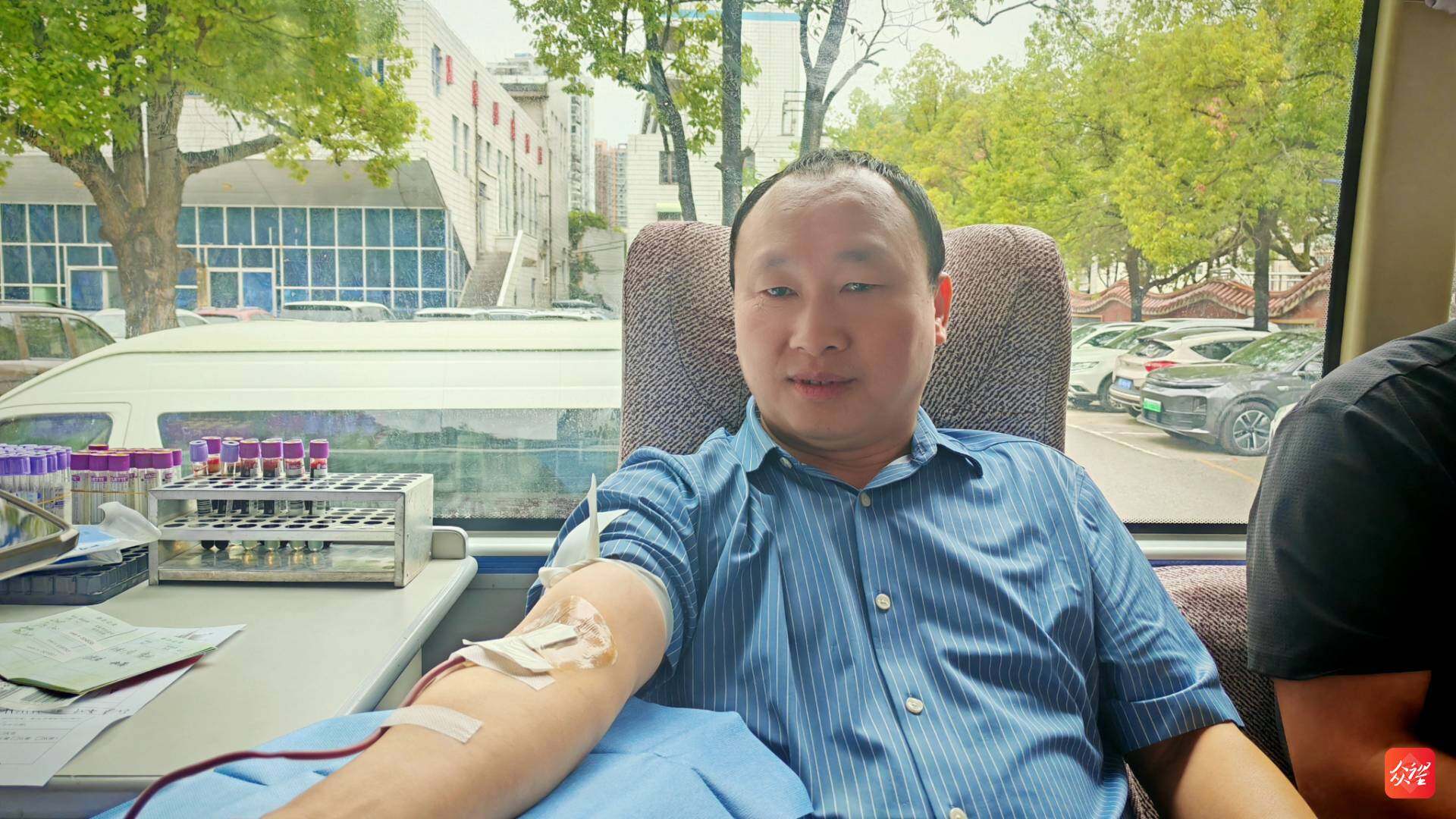 在采血车内,撸起袖子的干部职工们眼神坚定,有的看着血液缓缓流入血袋,脸上露出欣慰的笑;有的献完血后,还不忘在朋友圈分享:“今天解锁了‘热血奉献’新体验,为自己点赞!”