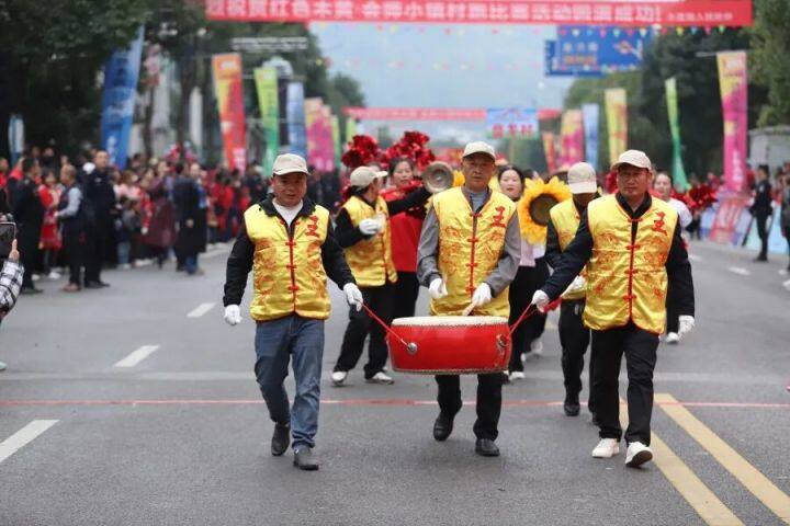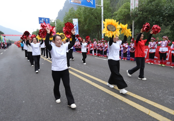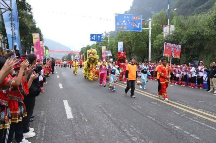 文昌村以舞狮开道,雄狮腾跃间,招式利落,配合“文化遗产文昌阁,产业振兴助村跑”的口号,彰显出古村焕新的精气神。中河村则用肩挑的筛子拼出“和美中河,隘达山泉”八个大字,生动展现了村集体经济依托山泉水资源发展的成果。