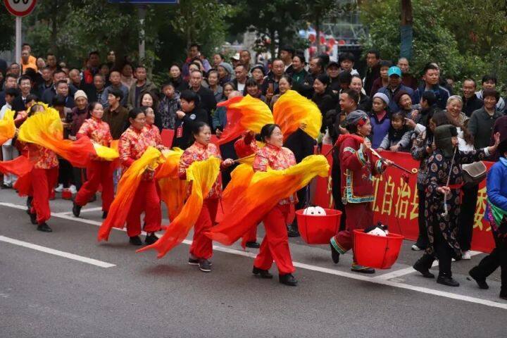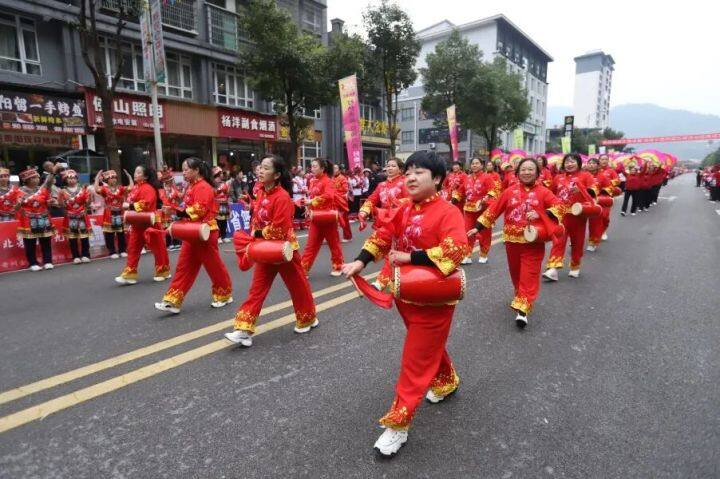 居委会与木黄村联合方阵将红色文化与民俗表演巧妙融合。腰鼓声声震天响,扇子舞翩翩展风采,再现了1934年红二、六军团胜利会师木黄的历史场景。如今,木黄人民赓续红色血脉,以歌舞喜迎八方来客,共品美酒、共赏村戏,军民鱼水情深的传统在新时代焕发新光彩。