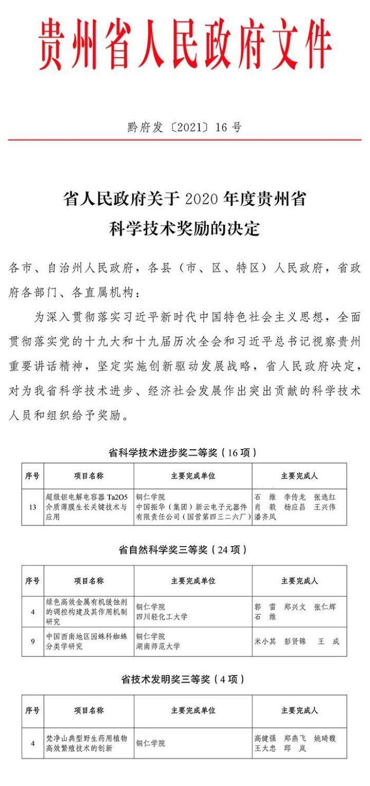 近日,全省科技创新暨科技奖励大会在贵阳举行,铜仁学院共有7项成果获得2020年度、2021年度贵州省科学技术奖。其中,省科学技术进步奖二等奖1项、省科学技术进步奖三等奖1项,省自然科学奖三等奖4项、省技术发明奖三等奖1项。获奖数量位列地方高校第一。