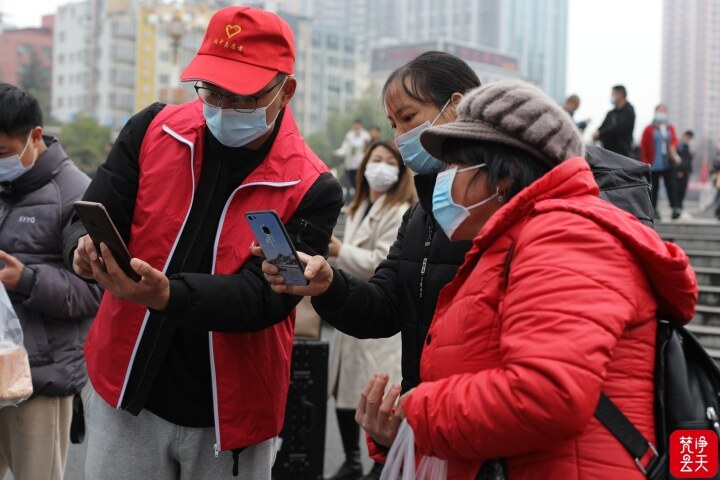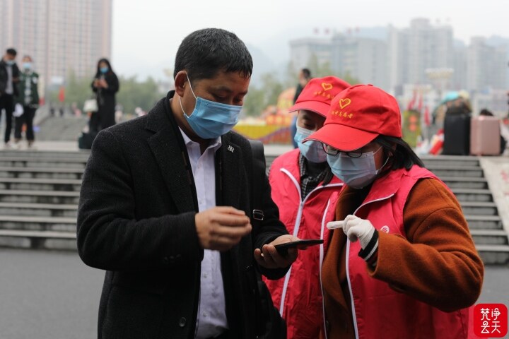 "请打开健康码""请带好口罩"……在铜仁火车站志愿服务现场,贵州省铜仁第一中学青年教师井然有序地检查旅客健康码、行程码,监督行人带好口罩。