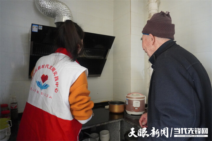 万山区新时代文明实践志愿者为旺家社区张华清老人清扫厨房。陈阳 摄