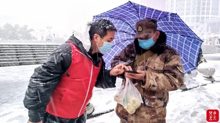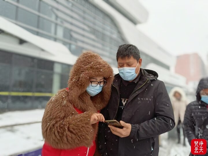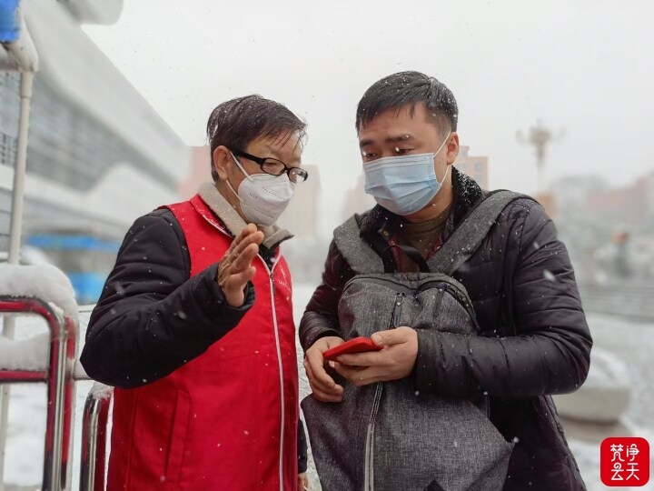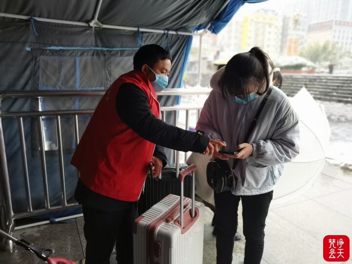 “阿姨,进这里面来看,外面在飘雪……”志愿者杨秀江一边提醒乘客打开健康码和行程码,一边招呼乘客进帐篷避雪,帮忙提箱子。