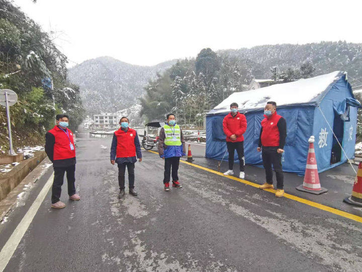 "降大雪、路太滑,疫情形势严峻,非紧急事务,请勿出门……"12月28日,风雪中,在松桃黄板镇青峰村与秀山交界处,穿着红外套的新时代文明志愿者刘文、陈刚、杨代均、李奎以及袁永林,在疫情防控卡点上耐心劝导过往群众。